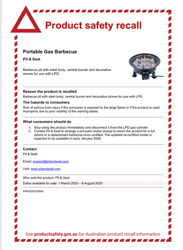 We are currently conducting a voluntary recall of the Pit & Seat portable gas barbecue (Certification No. 9276). All known customers have now been contacted twice.